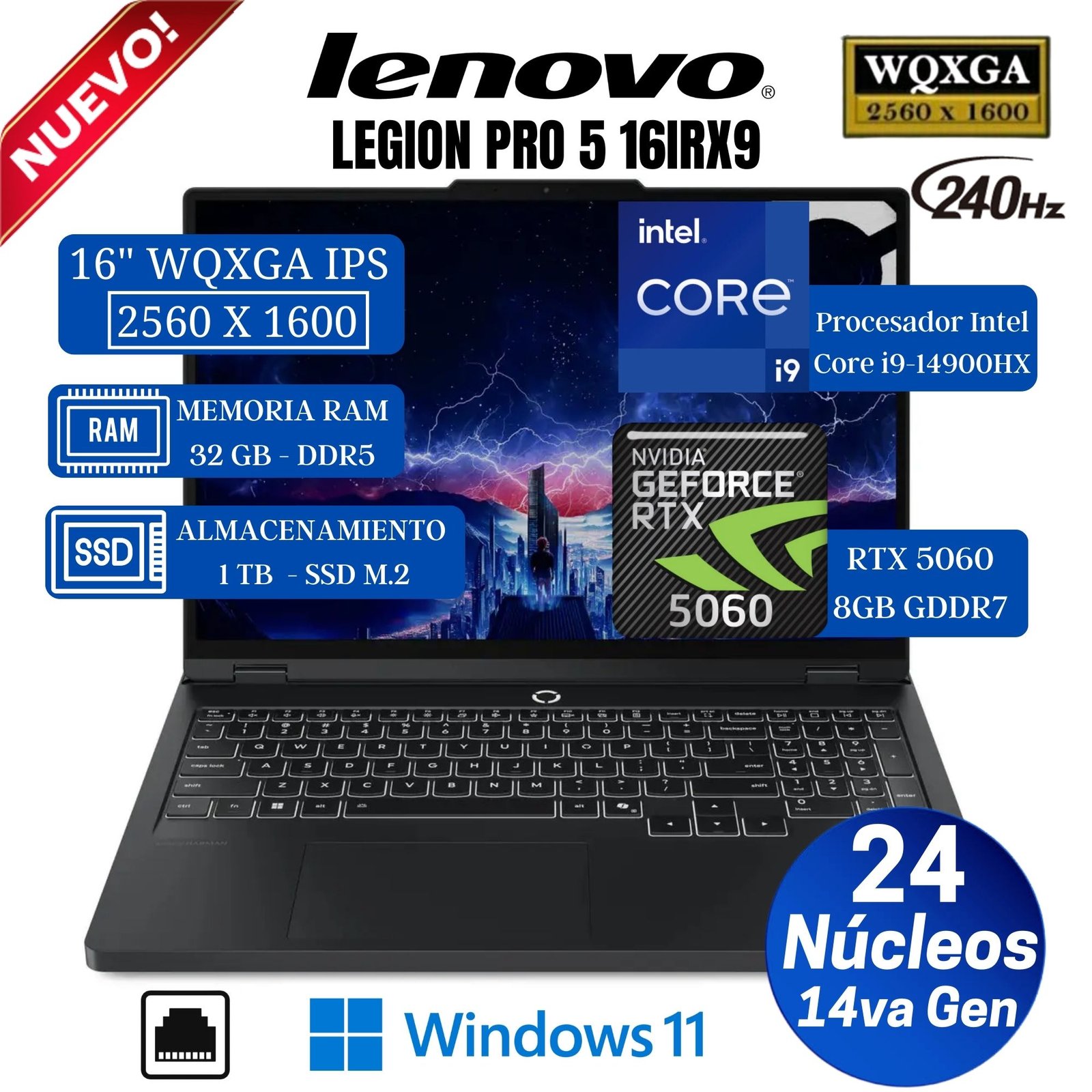 Laptop Lenovo Legion Pro 5 16IRX10 16″ WQXGA IPS, Intel Core i9-14900HX, 14va Gen, Ram 32GB, Ssd 1 TB, Free Dos (83NN0058LM)